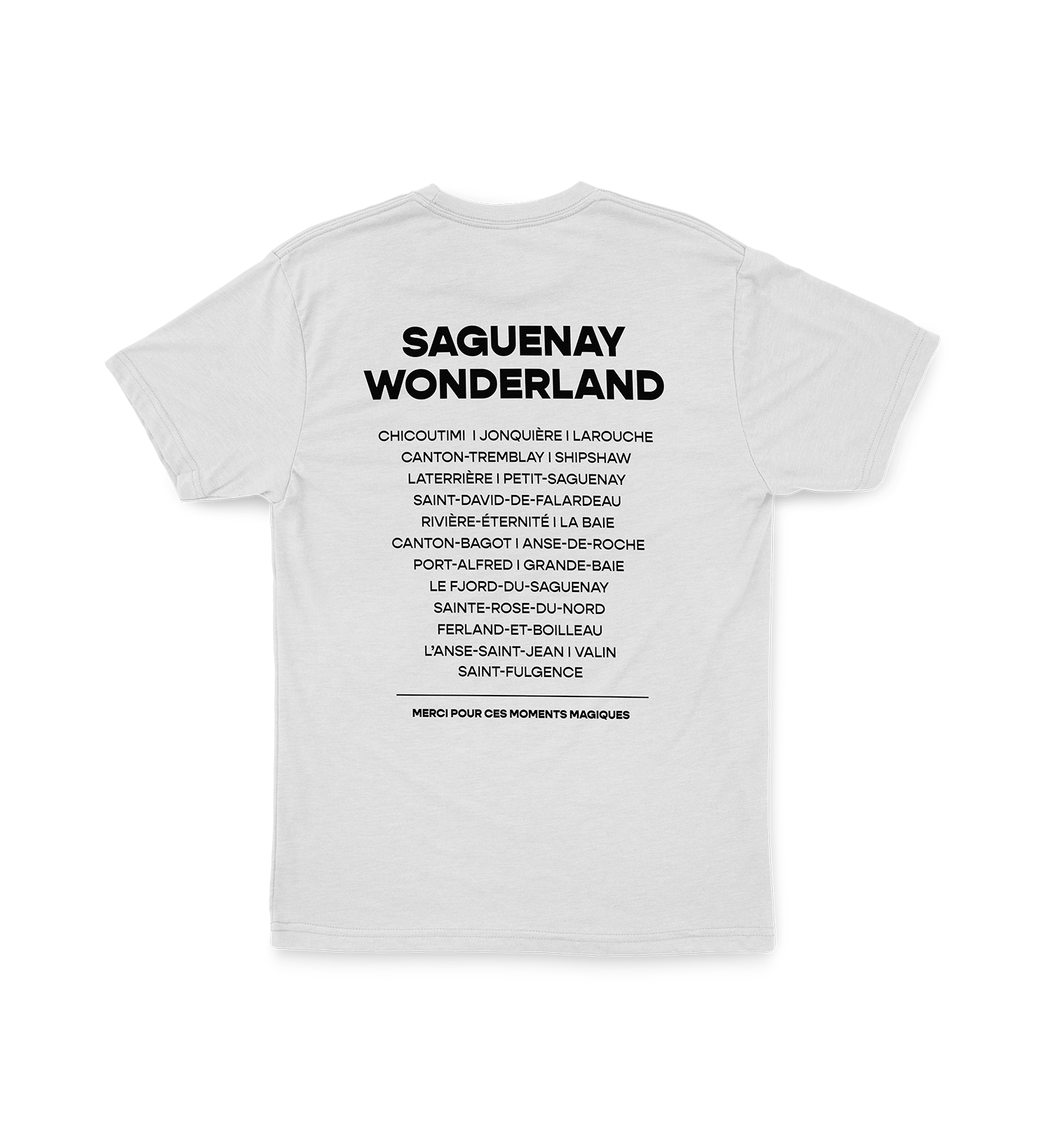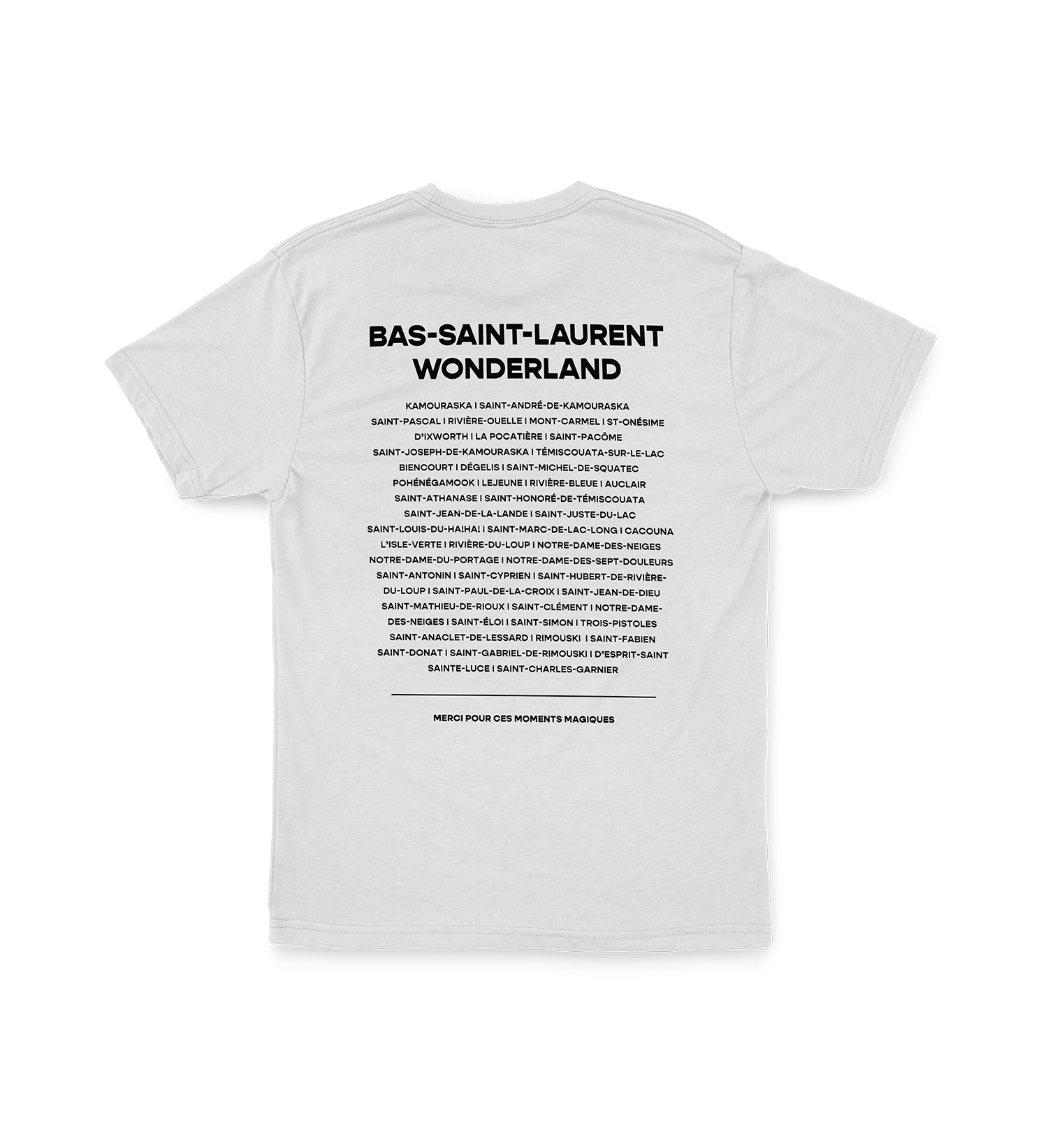 Un T-shirt personnalisé à ta région coup de coeur! Patch colorée au devant et liste des municipalités de ta région au dos.